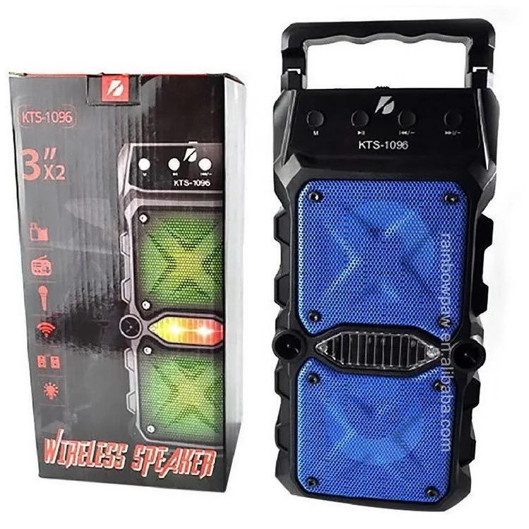 اسپیکر پرتابل KTS 1096 را می توان به شکل ایستاده به کار برد و علاوه بر بلوتوث، با کارت حافظه، فلش مموری و AUX سازگاری دارد. اسپیکر بی سیم KTS مدل 1096 حتی به ورودی میکروفون نیز مجهز شده است و همچنین وجود دو ساب 3 اینچی باعث شده است تا بتوانید قدرت صدای شگفت انگیز آن را برای تمرین آواز نیز به کار ببرید. ویژگی شگفت انگیز دیگر این اسپیکر، وجود رقص نوررنگی در هنگام پخش موزیک است. با اتصال یک میکروفون به اسپیکر میتوانید کارائوکه را با دوستان خود در هر مکانی تجربه کنید. قابلیت ویژه دیگر اسپیکر 1096 وجود فناوری TWS یا همان اتصال همزمان دو دستگاه برای قدرت صدای بیشتر می باشد. برای اتصال همزمان دو دستگاه به گوشی موبایلتان کافی ست دکمه M برای چند ثانیه نگه دارید تا ارتباط برقرار شود. درایورهای داخلی این بلندگو بی سیم، قدرتی برابر 10 وات برای آن رقم می زنند و با هر بار شارژ کامل باتری 800 میلی آمپر ساعتی آن امکان 3 ساعت پخش مداوم موزیک در اختیارتان خواهد بود. از ویژگی های دیگر اسپیکر وایرلس کی تی اس مدل 1096 می توان به رادیوی FM، برد 10 متری و پخش صدای استریو اشاره کرد.